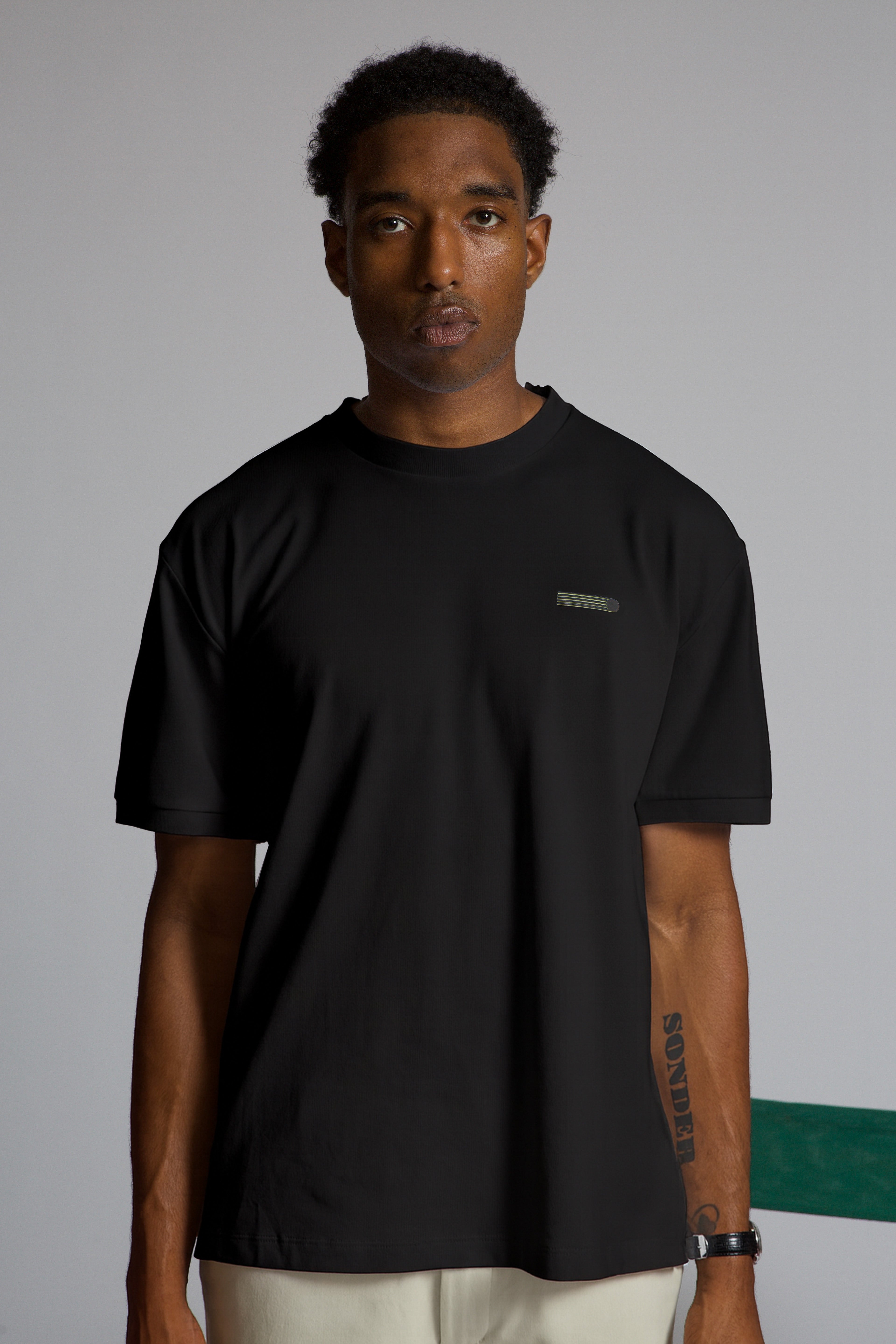 A classic t-shirt with a relaxed off-the-shoulder fit. Custom-developed pique fabric that has technical properties with a natural fiber hand feel.